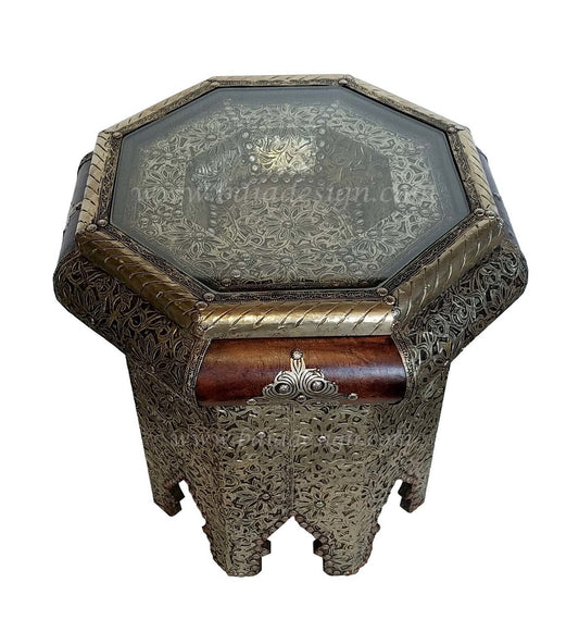 Embossed Metal and Bone Hexagonal Table with Glass Top
