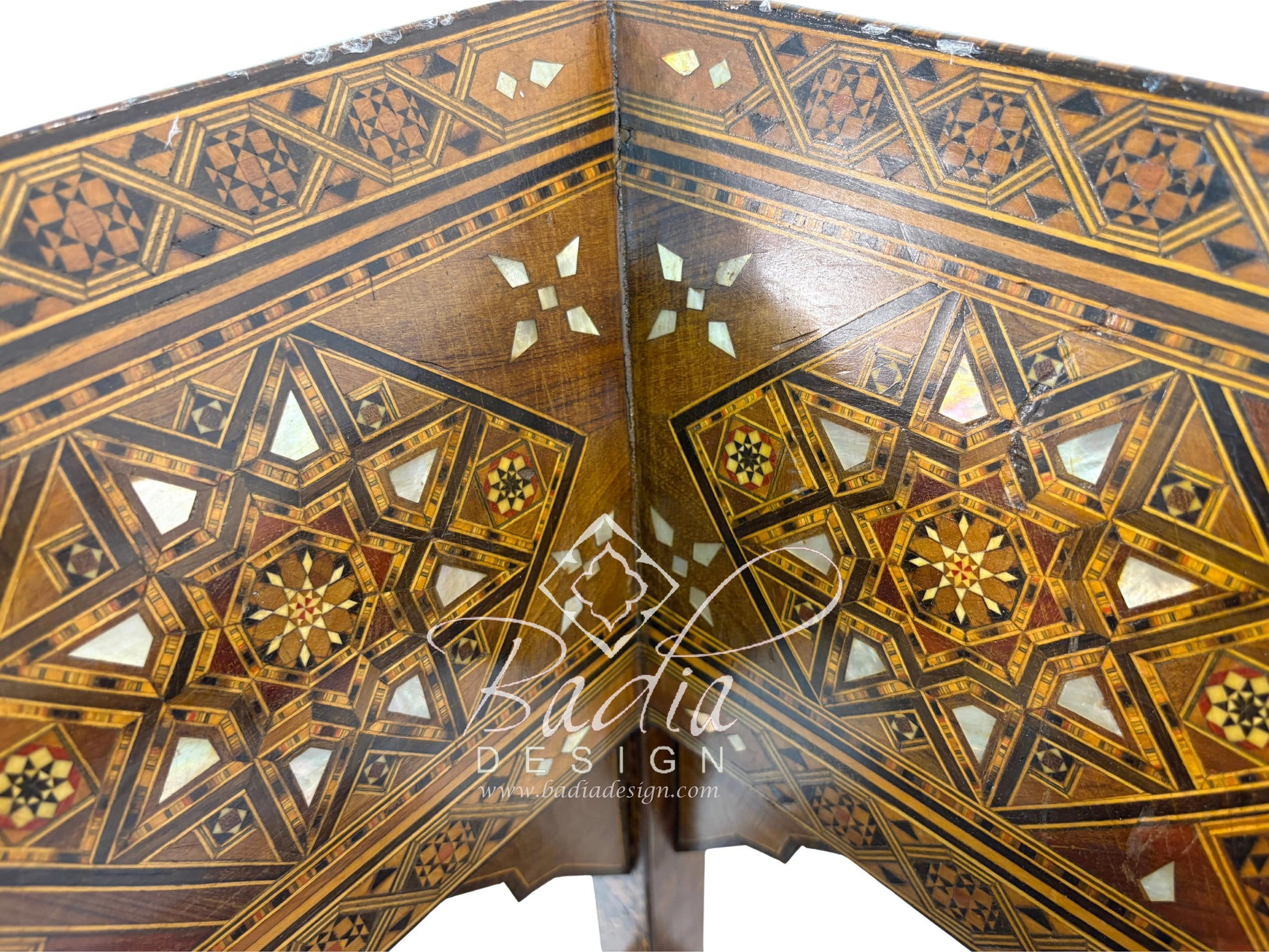 Add a touch of timeless elegance to your space with our Moroccan Handcrafted Mother of Pearl Inlay Chair. Carefully crafted by skilled artisans, this exquisite chair features intricate floral and geometric inlay patterns made from genuine mother of pearl, set into a richly stained wood frame.