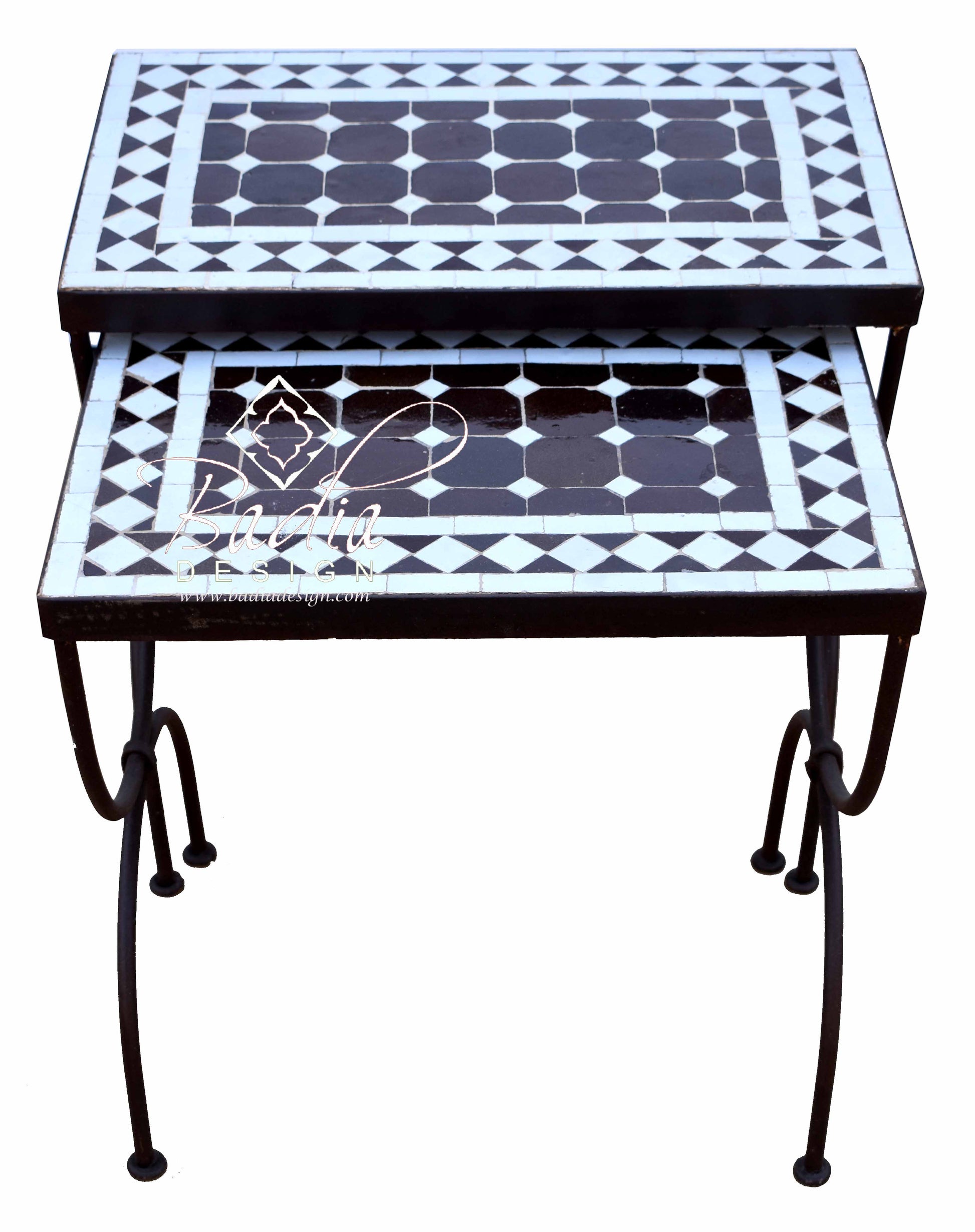 Two Piece Black and White Moroccan Nesting Tile TablesSizes: M: 17 3/4" W x 11 3/4" D x 17 1/2" HL: 19 3/4" W x 11 3/4" D x 19 1/2" HNote: Extra shipping costs may apply to this item due to its weight, size and your location. It may have to be shipped through a freight company and charges vary from state to state. You will be notified by email of any additional shipping charges once the item is packaged and ready for shipment. We always look for the most competitive shipping company to minimize shipping costs to our customers.