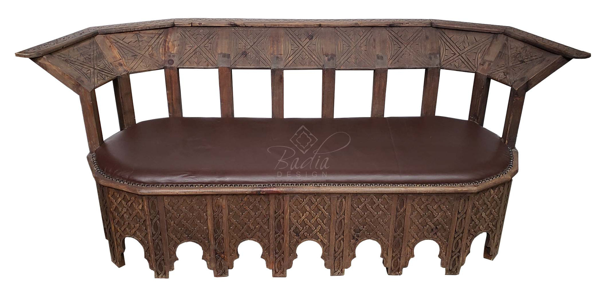 Hand Carved Wooden Bench with Leather Seat