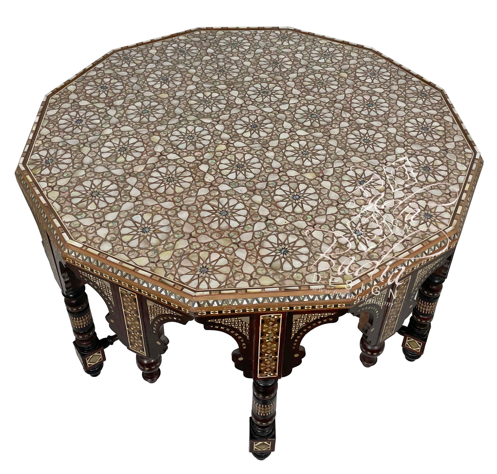 Large Moroccan Mother of Pearl Inlaid Coffee TableSize: 41" W x 24" HStyle#: MOP-ST114This beautiful table can be used in just about any room in your home or office. It can also be used for wedding venue decor or special events.Note: Extra shipping costs may apply to this item due to its weight, size and your location. It may have to be shipped through a freight company and charges vary from state to state. You will be notified by email of any additional shipping charges once the item is packaged and ready for shipment. We always look for the most competitive shipping company to minimize shipping costs to our customers.