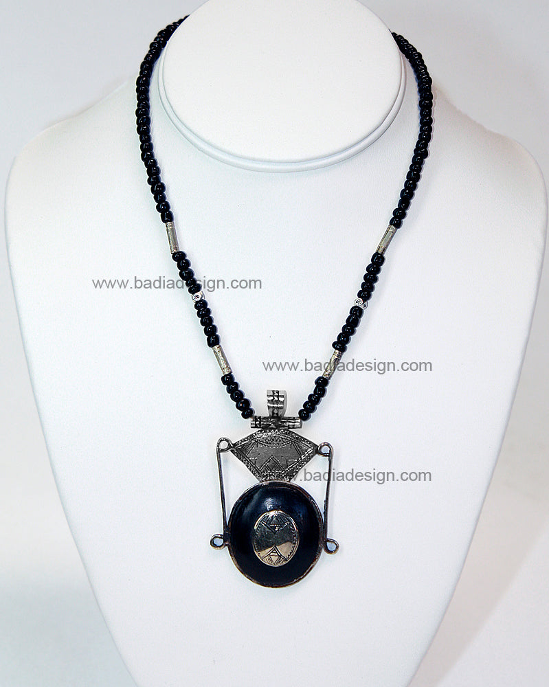 Moroccan Black Pendant Necklace with Silver Metal Design - J045