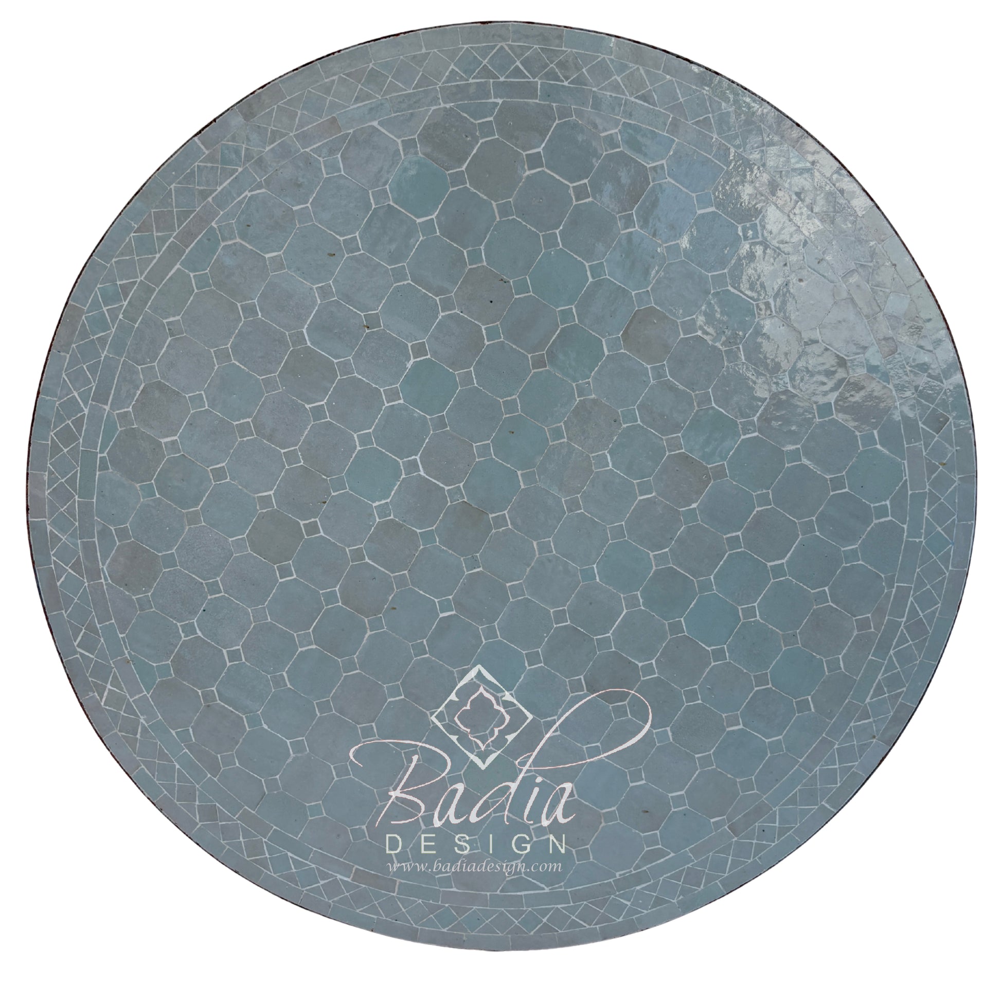Our Moroccan Gray Tile Table Top from Badia Design Inc. blends subtle sophistication with authentic craftsmanship. The neutral gray tiles, carefully arranged in a classic Moroccan mosaic pattern, create a surface that is both elegant and adaptable, fitting effortlessly into a wide range of indoor and outdoor settings.