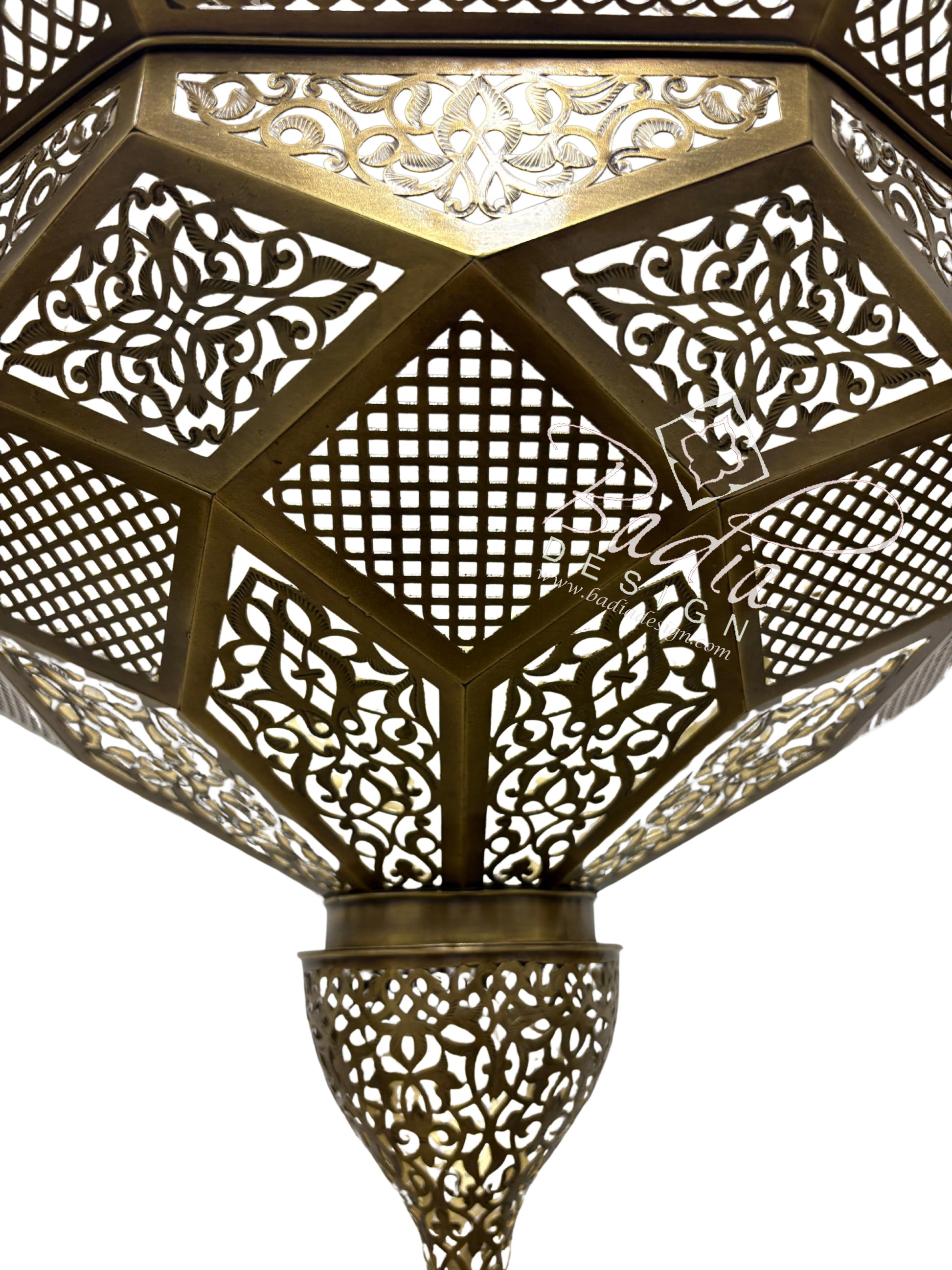 Illuminate your home with our Multi-Tiered Brass Chandelier with Geometric Designs, a handcrafted Moroccan masterpiece featuring ornate brass patterns and a bold architectural form.