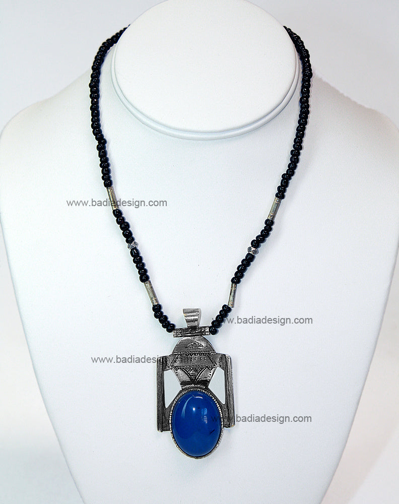 Moroccan Necklace with a Blue PendantNecklace Length: 16" LongPendant Dimension: 1 3/8" W x 2 1/2" HStone: Blue StoneStyle #: J046