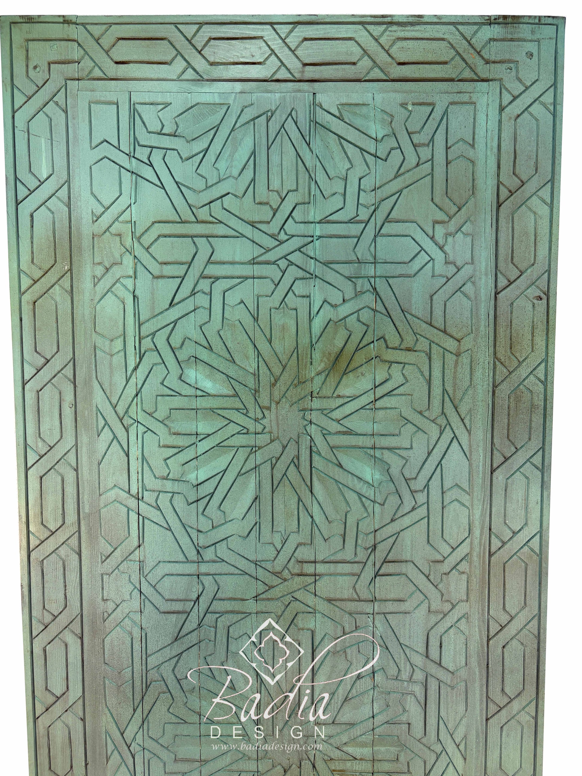 Moroccan Green Vintage Hand Carved Wooden Door with Geometric Designs