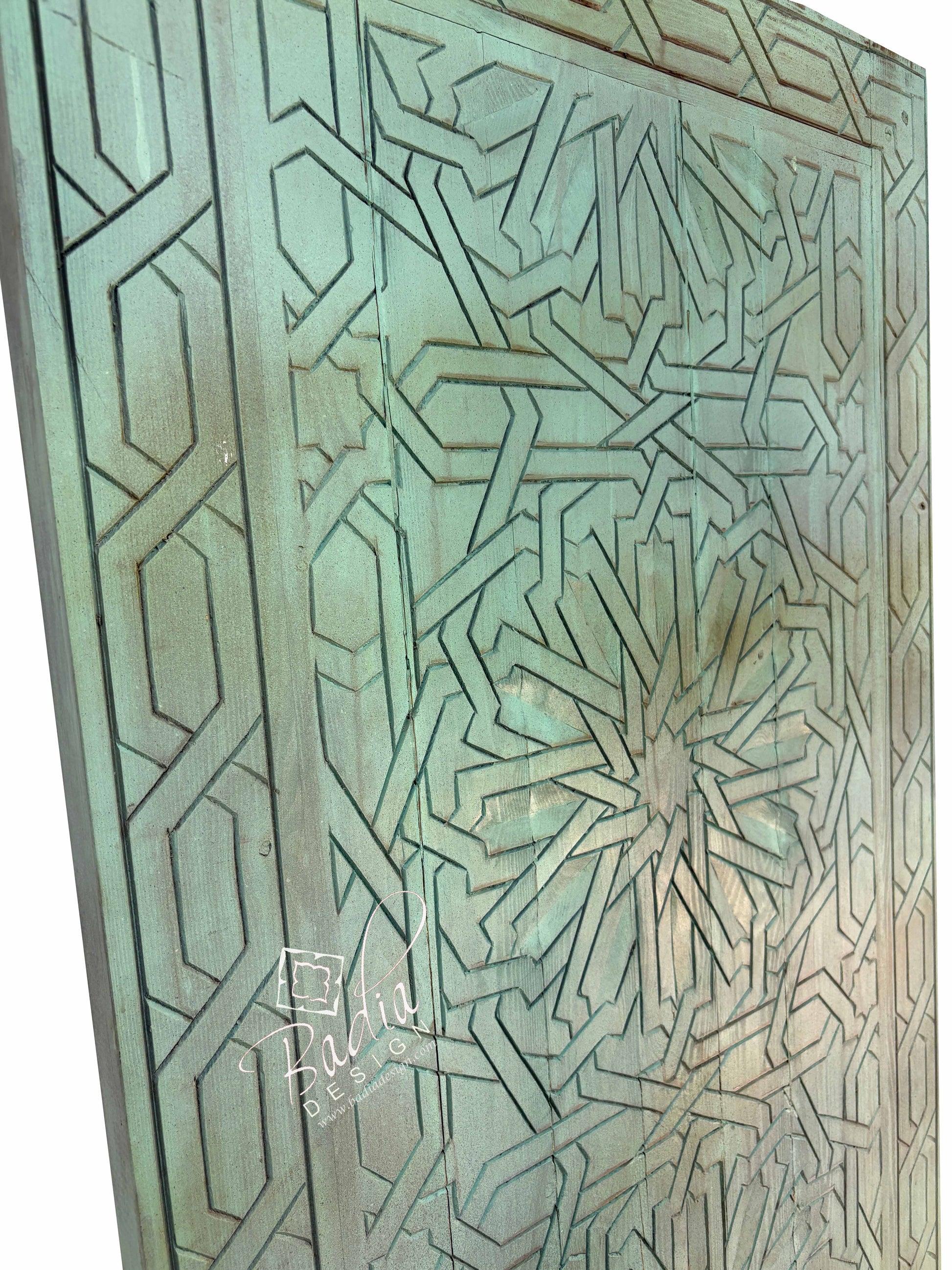 At Badia Design Inc., we are proud to offer our Moroccan Green Vintage Hand Carved Wooden Door with Geometric Designs, a stunning example of traditional Moroccan craftsmanship. Handcrafted from solid wood, this vintage piece features a deep green stained finish that highlights the intricate geometric carvings, embodying the bold patterns and cultural depth of Moroccan design.