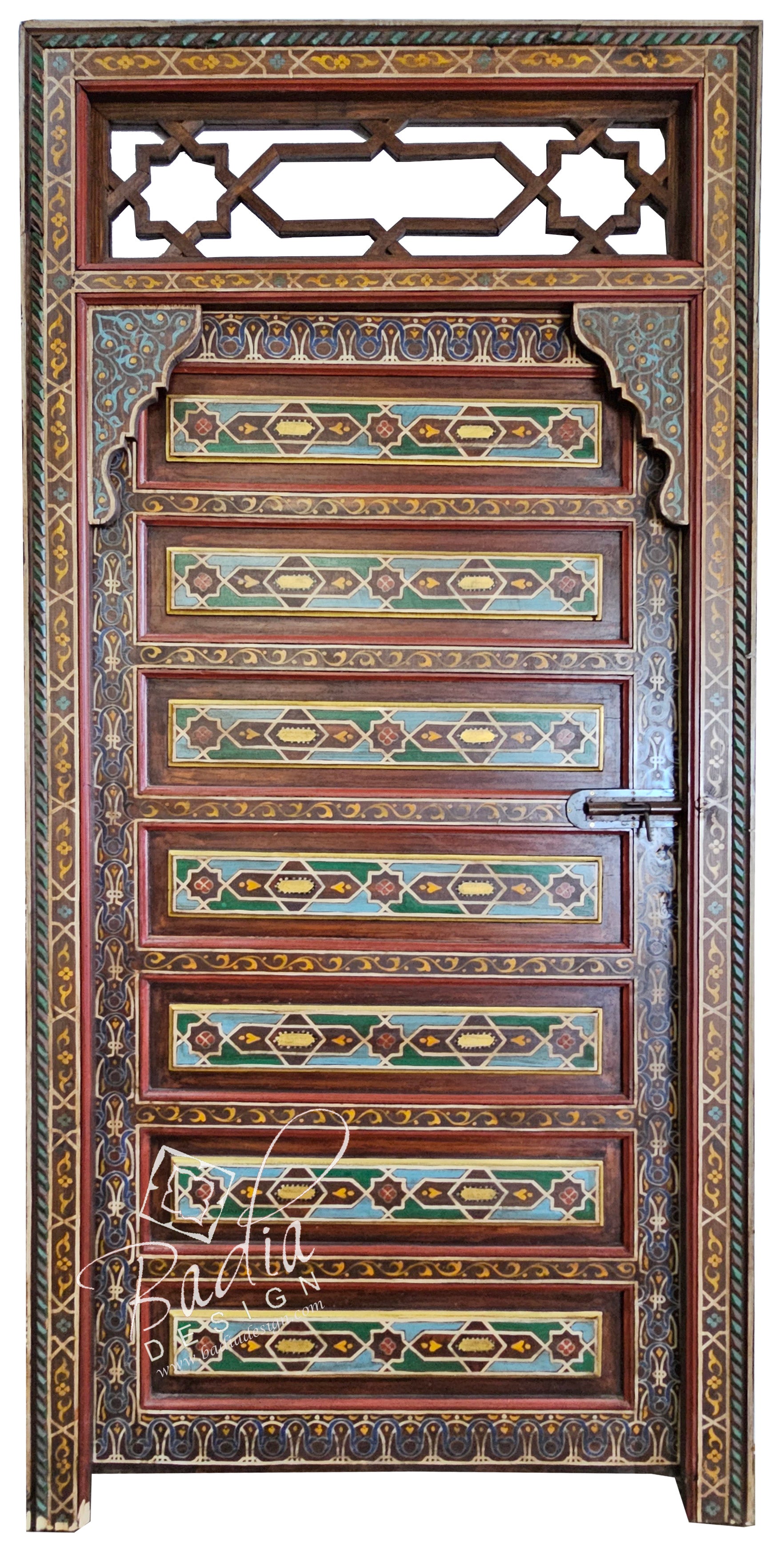 Moroccan Red Multi-Color Hand Painted Wooden DoorSize: 47 3/4" W x 3" D x 92" HStyle #: HPD043Due to the size and weight of this door, please contact us for a shipping quote before purchase.Badia Design Inc.Tel: 818-762-0130Email: info@badiadesign.comNote: Extra shipping costs may apply to this item due to its weight, size and your location. It may have to be shipped through a freight company and charges vary from state to state. You will be notified by email of any additional shipping charges once the item is packaged and ready for shipment. We always look for the most competitive shipping company to minimize shipping costs to our customers.