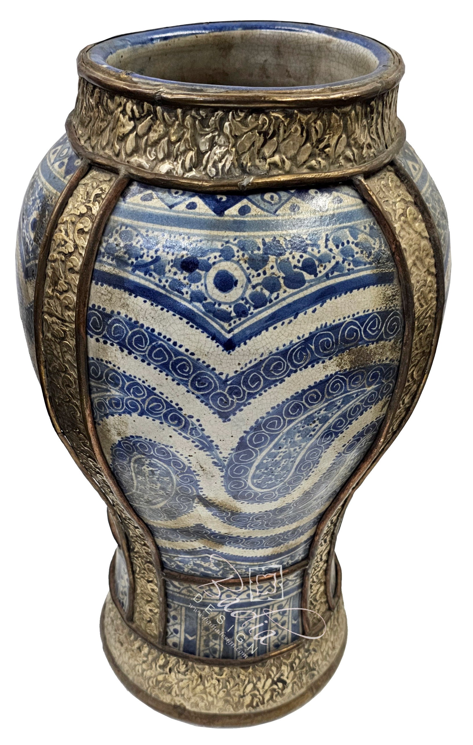 Moroccan Blue and White Vintage Metal and Ceramic Urn