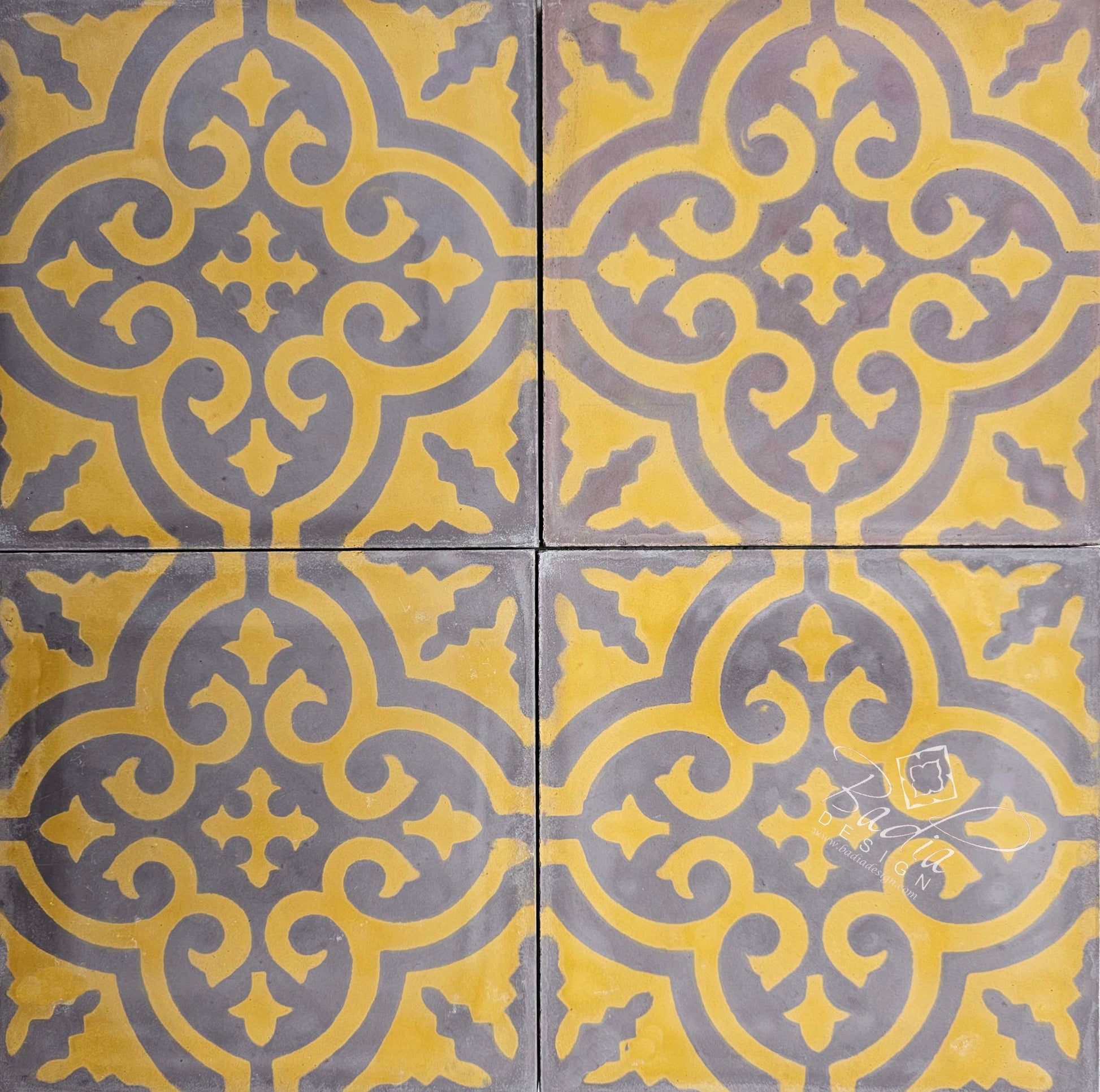 Moroccan Yellow Cement Floor Tile Four tiles make up one complete design.Size: 8" x 8" with a 5/8" ThicknessStyle #: CT139If you would like to order tiles or need assistance with your tile project, please fill out our How to Order Tiles form.Contact us for price and availability: Tel: 818-762-0130 Email: info@badiadesign.com Please Note: all our tiles are handmade and there may be some small imperfections such as chips, unevenness or tiny cracks which is characteristic of handmade tiles. This should not be considered as damaged or defective tiles.Badia Design’s Authentic Handcrafted Moroccan Tile displays a natural, beautiful and exotic look to your living area, kitchen, hallway, bathroom, patio or any area of your home or business. Our Moroccan Cement Floor Tiles are handmade by our skilled artisans in Morocco and are given great attention to detail.They come in many different colors and designs and are enhanced by an immersion of intertwined geometric shapes and borders filled with traditional and beautiful Moroccan colors.Our Moroccan Cement Tiles can be used inside or outside on floors, walls and are suitable for patio and public areas. They are also perfect for your kitchen, bathroom, wall and backsplash.Whatever the decorating need, our Moroccan Cement Floor Tiles are a lasting and valued choice for any home or business project.Moroccan Multi-Color Cement Floor Tiles